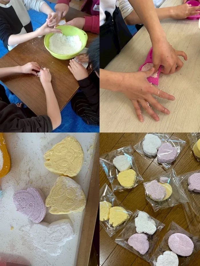 バスボムつくり🫧 26.03.09 ブログ こんにちは! わくわく本宮です🤗 今日の活動はバスボム作りでした! 重曹とクエン酸、食紅を使って作ります! 子どもたちは自分の好きな色と型を選び、1人2個ずつ作りました✨ 完成したバスボムを少し水に入れてみると、 「シュワシュワ🫧」と音を立てて溶けていき、子どもたちもびっくり😳 「今日お風呂に入れるんだあ!」とニコニコしながら、楽しそうに作ることができました😆 « テッテ 楽器作り🎼🥁🎼 雪遊び☃ » 関連記事 2025.12.05 爆弾投げ競争💣 2025.12.24 焼きそば⭐️餃子 2025.10.28 ハロウィンおにぎり🎃🍙 2025.12.01 駄菓子屋⭐️公園 2026.01.22 ルールあそび🎈 2025.12.19 サンドイッチ作り🥪